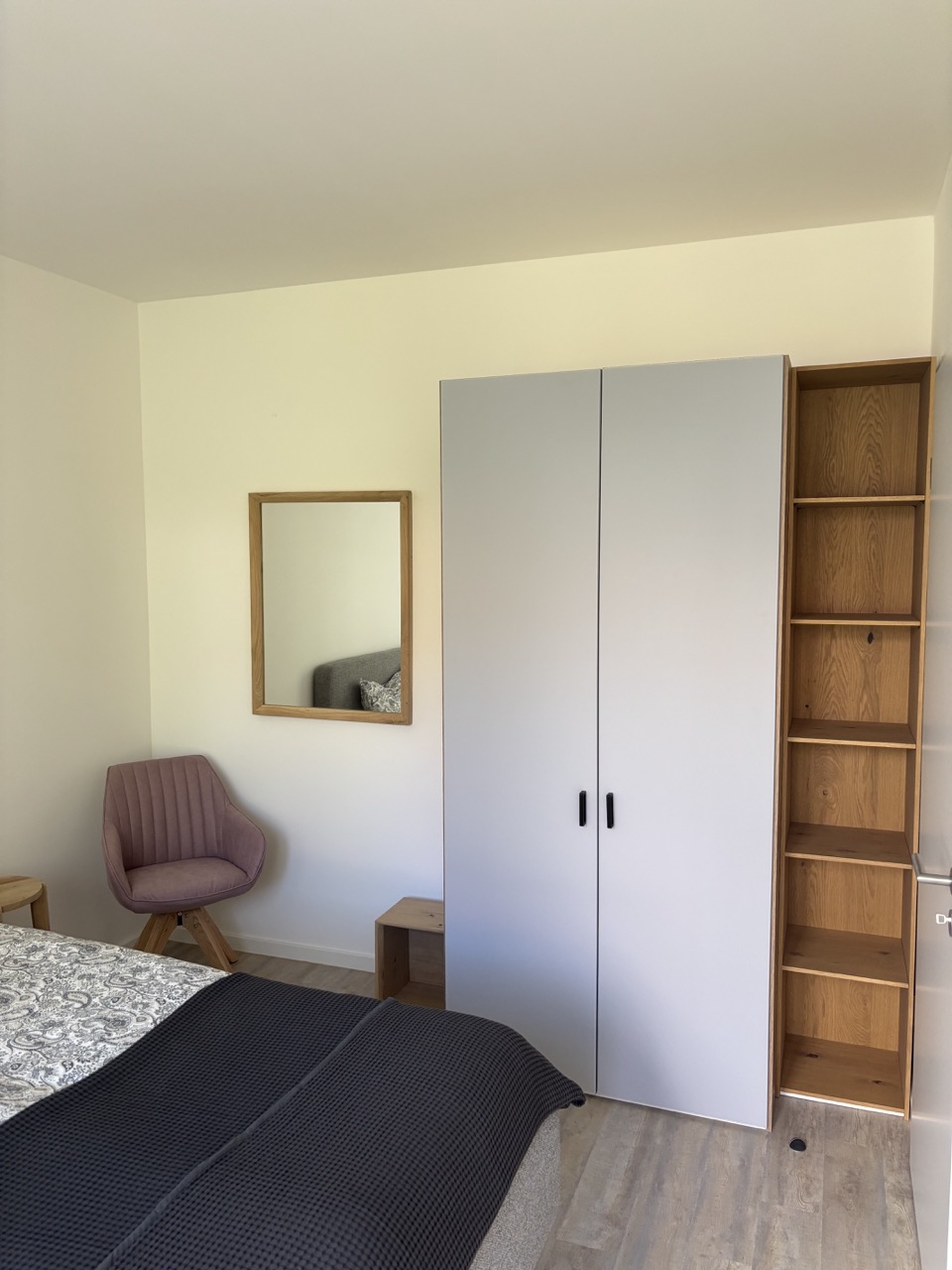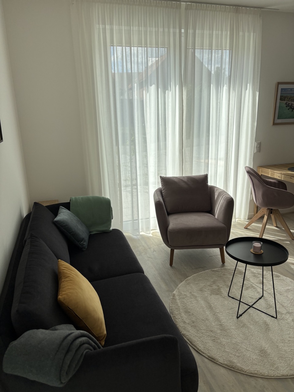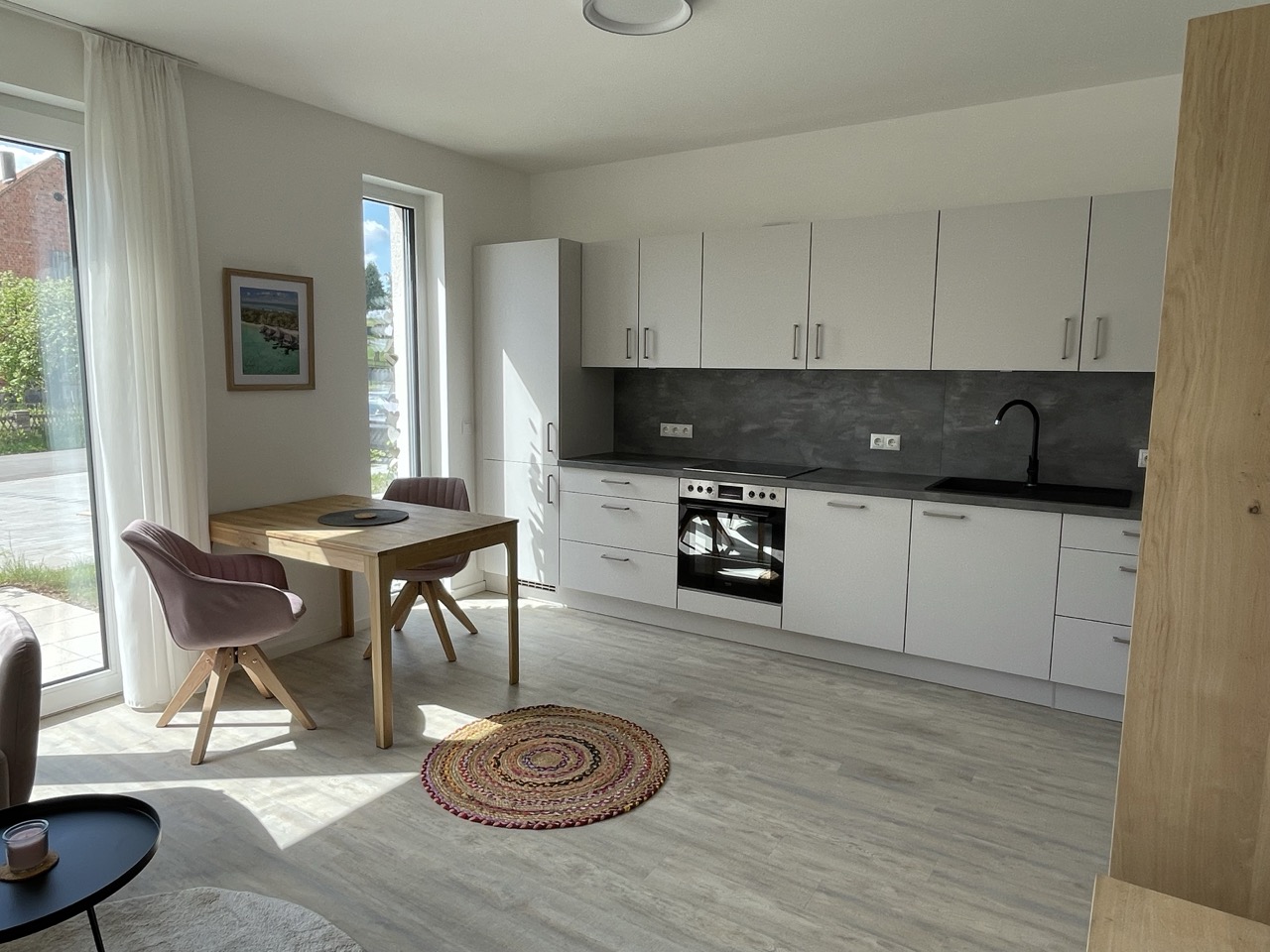 Der Wohnbereich ist offen gestaltet und bietet genügend Platz zum Entspannen, Arbeiten oder Genießen. Die voll ausgestattete Küche ist ideal für Gäste, die gerne selbst kochen oder längere Zeit bleiben möchten. Das Schlafzimmer ist bewusst schlicht und gemütlich gehalten – ein Rückzugsort, der erholsamen Schlaf ermöglicht. Das moderne Badezimmer überzeugt mit klaren Linien und einer komfortablen Dusche.
